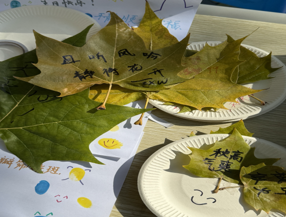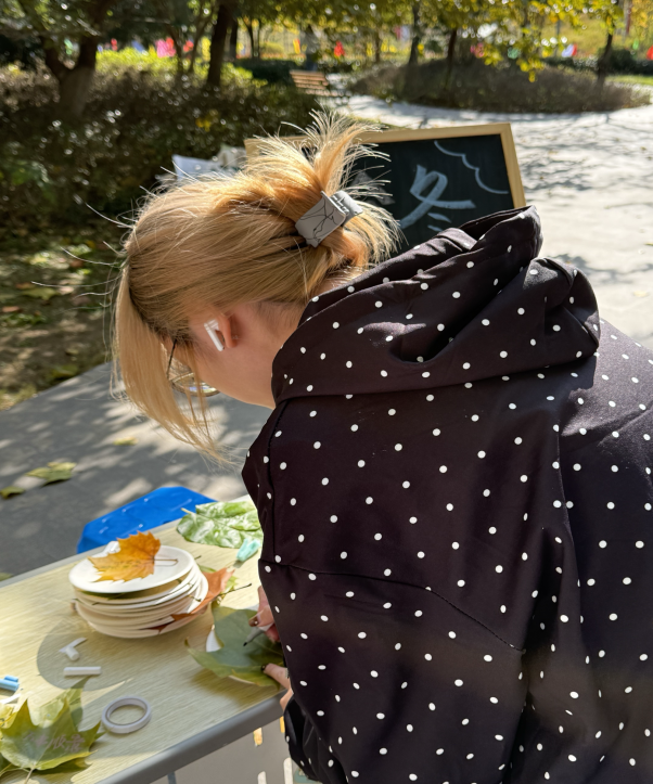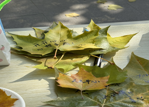 活动现场,同学们用笔墨将当下的心情与期许写进叶脉,每一片叶子都承载着独特的情绪与心愿。随后,大家将写好的叶片精心贴在纸盘上,让普通的落叶成为了传递温柔的“小确幸”。数十片写满温言的落叶,在纸盘上拼成了一幅带着温度的“秋日拼图”——每一片叶子,都是一个轻装上阵的心愿,也是校园里悄悄流动的温柔。
