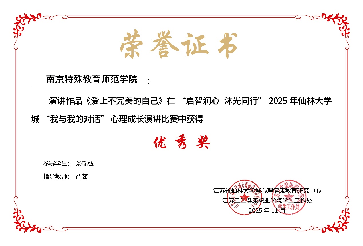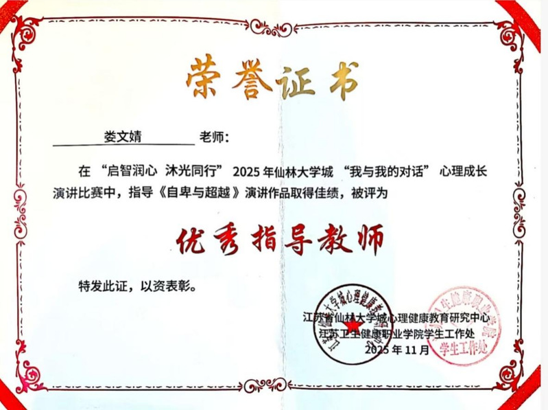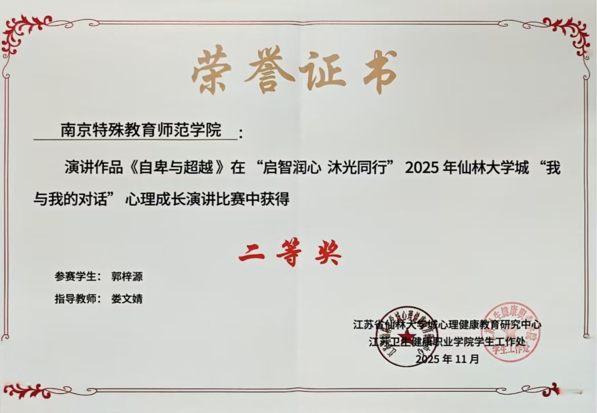 为积极响应省教育厅“五育润心 沐光同行”的心理健康教育活动主旨,进一步普及和宣传心理健康知识,增强大学生心理健康意识,积极营造丰富多彩的校园心理文化氛围,由仙林大学城心理健康教育研究中心主办、江苏卫生健康职业学院承办的“启智润心 沐光同行”第二届心理成长演讲比赛活动,得到了大学城各高校的积极响应,共有15所高校提交了共27份参赛作品。历经初赛作品征集评审、决赛现场展演等环节,赛事圆满落幕,我校学子凭借真挚的情感表达与深刻的心灵感悟脱颖而出,取得优异成绩! 本次比赛以“我与我的对话”为主题,为大学生提供了探索自我、传递心灵力量的优质平台。我校学子郭梓源在决赛中以真实鲜活的成长故事和饱满深切的情感共鸣,荣获二等奖;