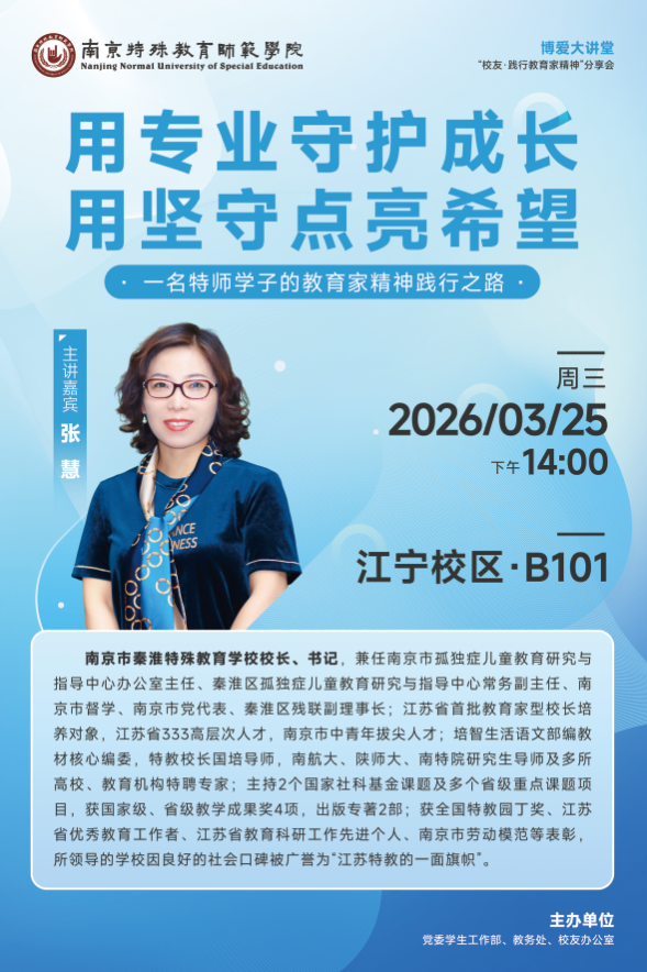 主讲嘉宾简介:张慧,南京市秦淮特殊教育学校校长、书记,兼任南京市孤独症儿童教育研究与指导中心办公室主任、秦淮区孤独症儿童教育研究与指导中心常务副主任、南京市督学、南京市党代表、秦淮区残联副理事长;江苏省首批教育家型校长培养对象,江苏省333高层次人才,南京市中青年拔尖人才;培智生活语文部编教材核心编委,特教校长国培导师,南航大、陕师大、南特院研究生导师及多所高校、教育机构特聘专家;主持2个国家社科基金课题及多个省级重点课题项目,获国家级、省级教学成果奖4项,出版专著2部;获全国特教园丁奖、江苏省优秀教育工作者、江苏省教育科研工作先进个人、南京市劳动模范等表彰,所领导的学校因良好的社会口碑被广誉为“江苏特教的一面旗帜”。