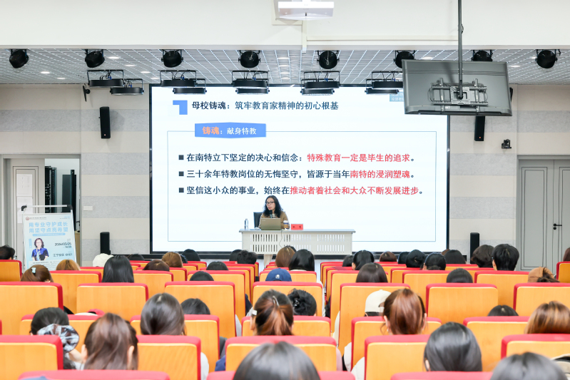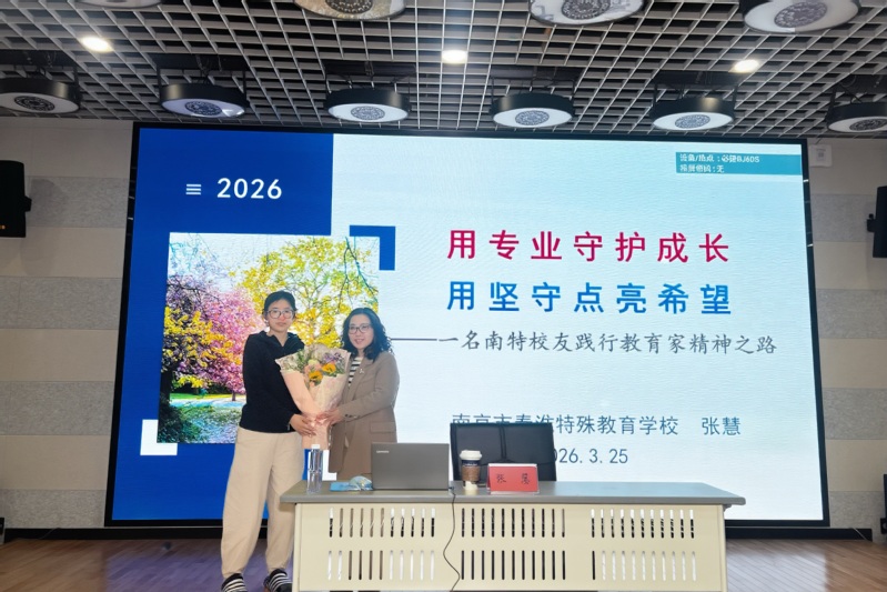 分享会上,张慧校长结合自身一线特教实践,深情回顾了从南特学子成长为特教领域领军人才的奋斗历程。她以“专业”与“坚守”为核心,串联起在校求学期间埋下的特教初心、江苏特教一线的教学深耕、课程改革探索与系统育人理念构建的全过程,用一个个真实可感的育人案例,生动诠释了教育家精神在特殊教育领域的时代内涵。她情系母校、寄语学弟学妹,要把专业本领练扎实,把育人初心守到底,将个人成长融入特殊教育事业发展大局。